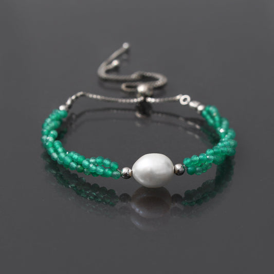 Green Onyx /Pearl Twist Layer Silver Bracelet ( Bolo Chain )