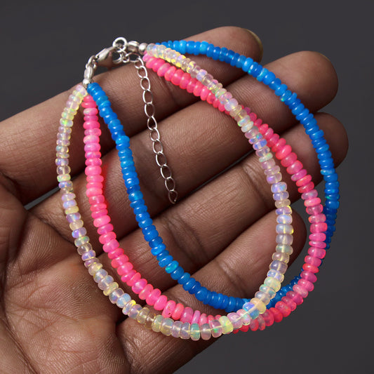 Pink Blue White Ethiopian Opal, 3 Strand Beaded Bracelet, Silver Smooth Bracelet .