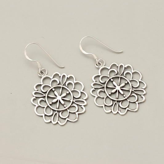 925 Sterling Silver Floral Mandala Dangle Earrings | Handmade Oxidized Silver Drop Earrings for Women