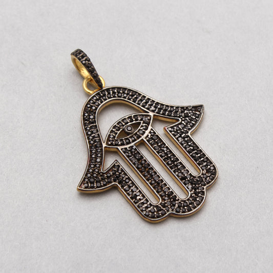 Black Spinel Hamsa With Evil Eye Silver ( Oxidized ) Pendant,