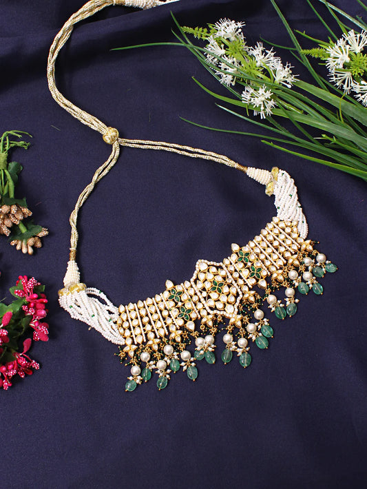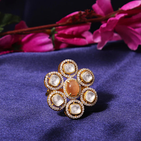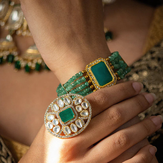Adjustable Elegance: Faux Emerald & Polki Diamond Traditional Ring -Timeless Beauty