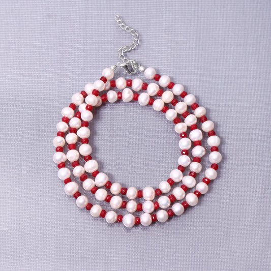 Ruby Quartz Bricks and Pearls Handcrafted Necklace with 925 Sterling Silver Chain