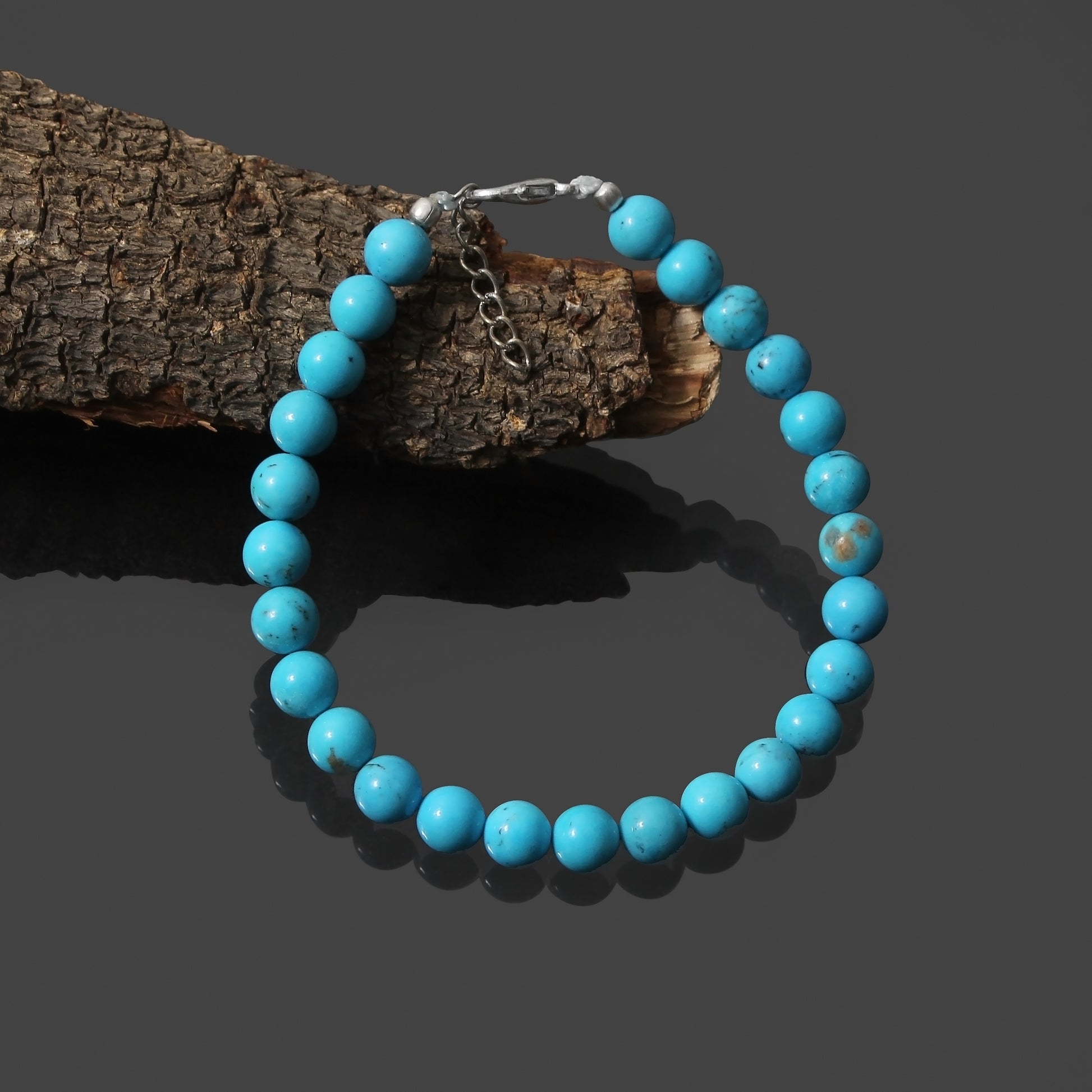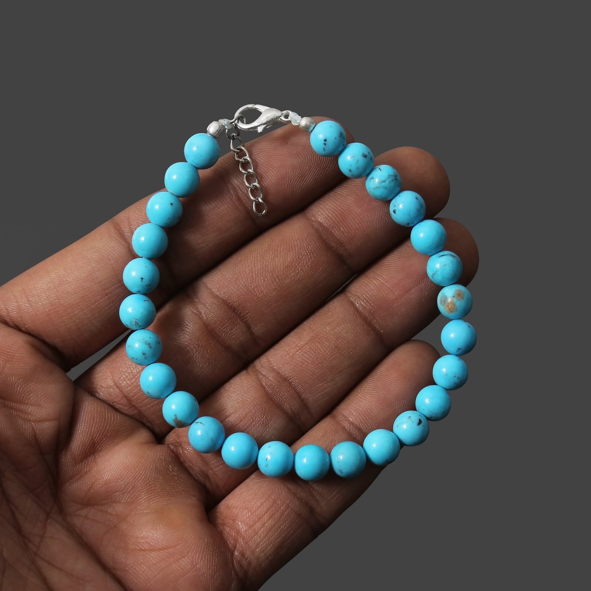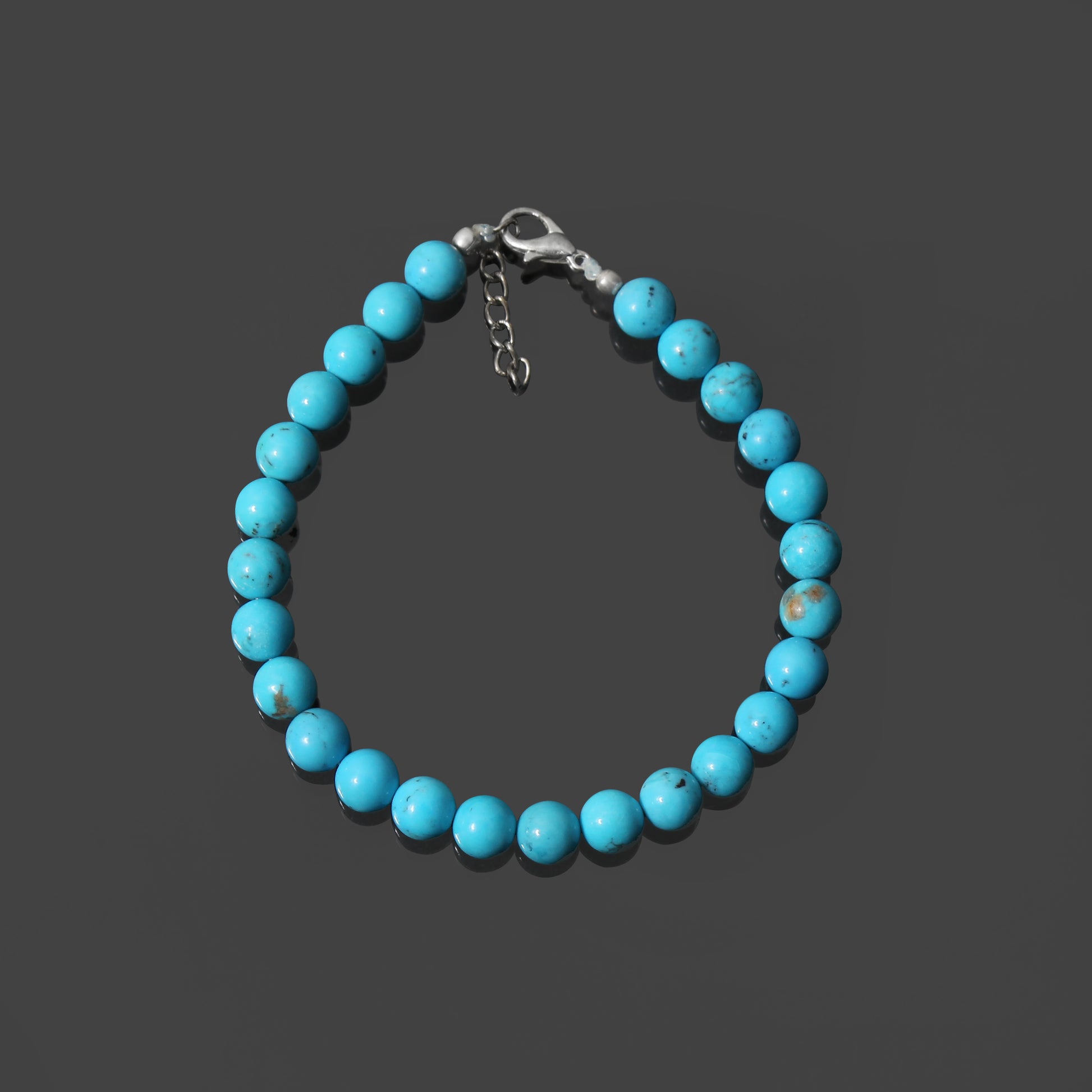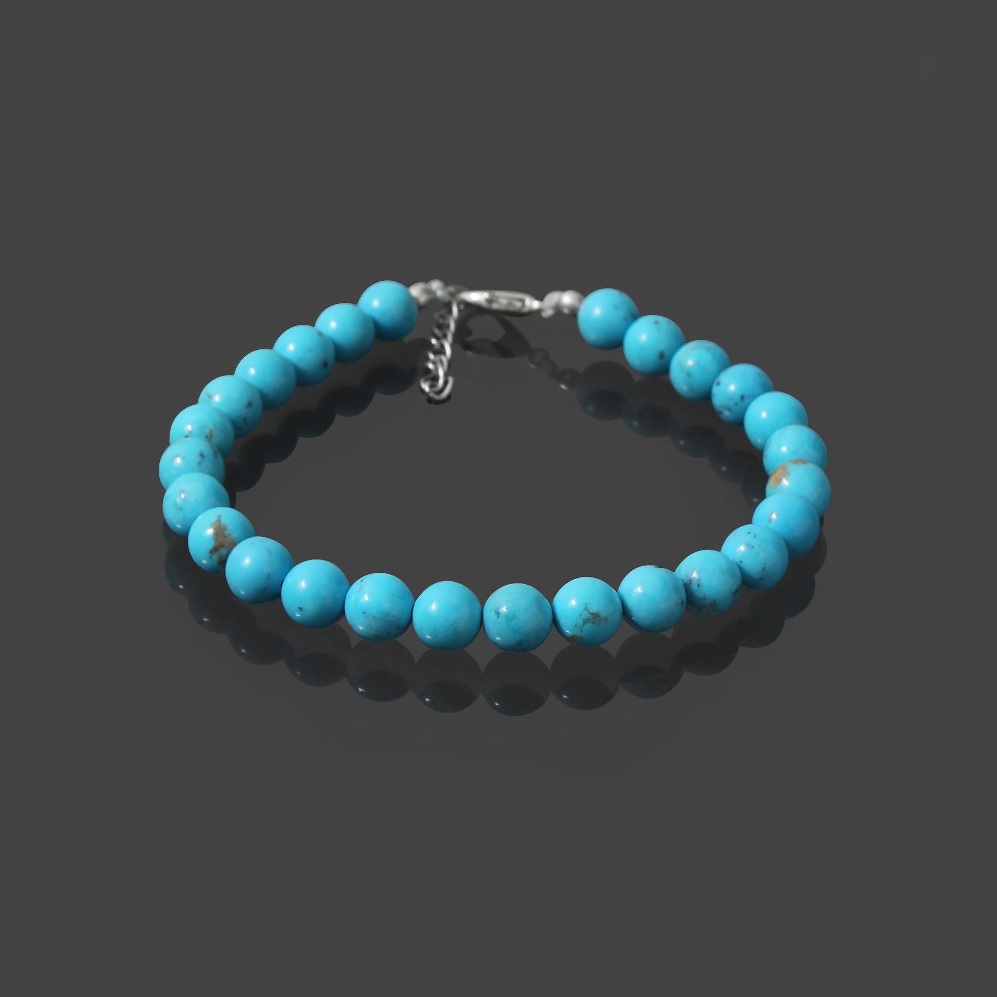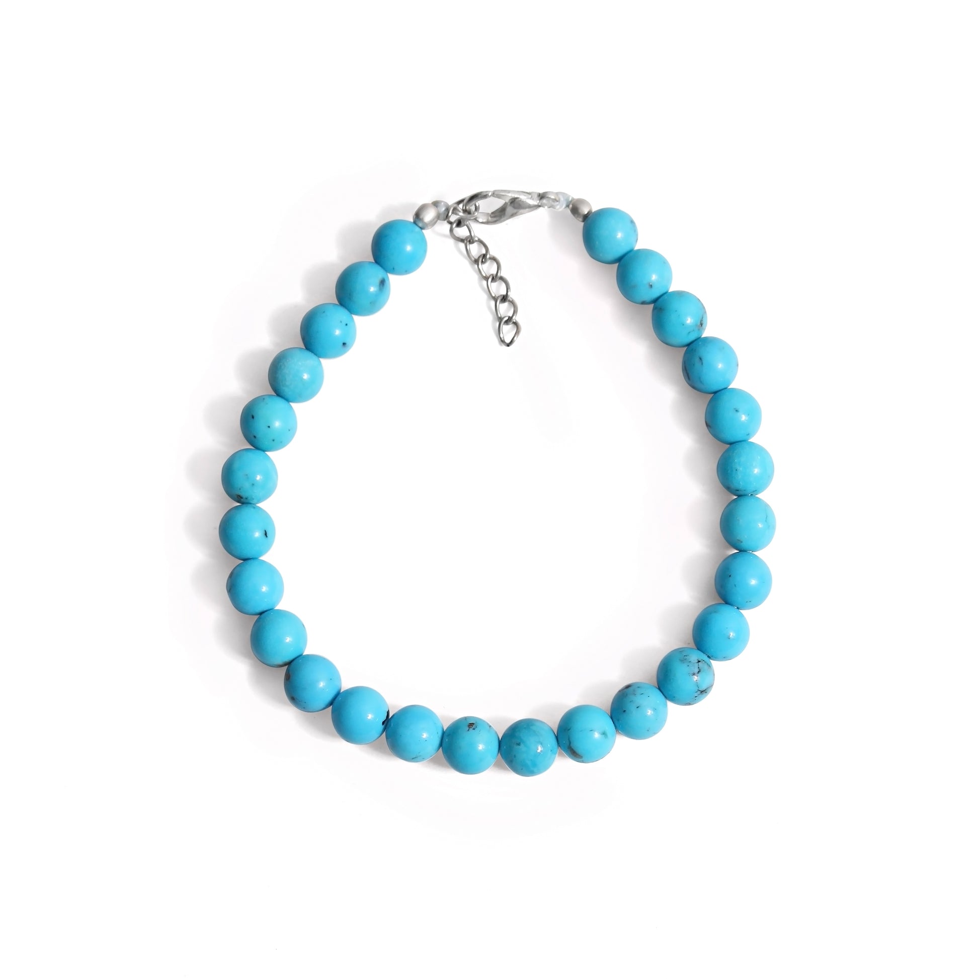 Turquoise is renowned for its calming and protective properties, believed to promote tranquility and inner peace. It is said to enhance communication and bring balance to the mind and body. Adorn your wrist with this exquisite smooth round bracelet featuring a secure lobster lock to experience the soothing embrace of turquoise.